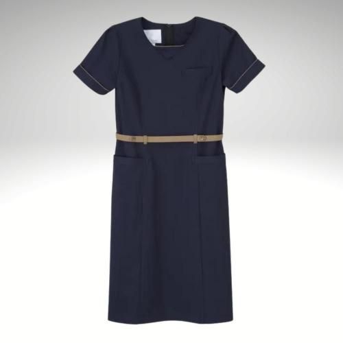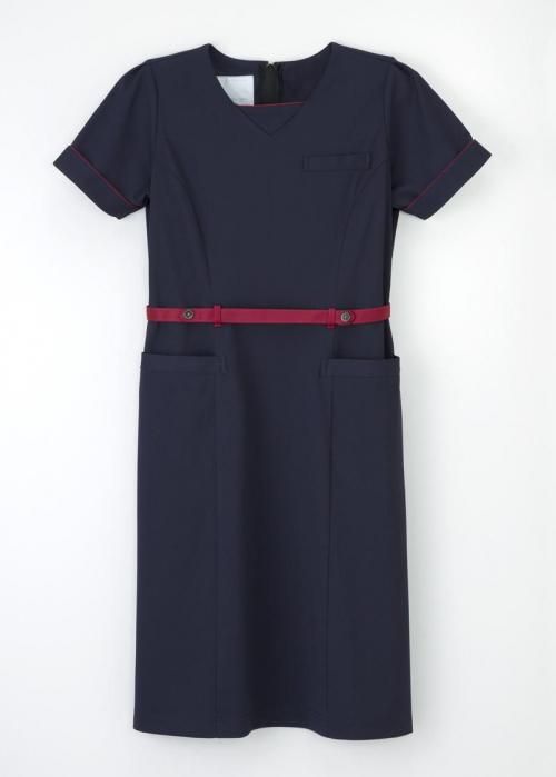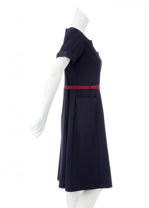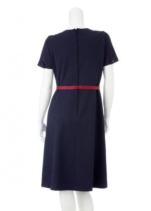 キチンとした印象のシンプルなワンピース。配色のベルトが全体を引き締めるデザインポイントになています。高機能なニット素材を使用していますので着心地も快適です。