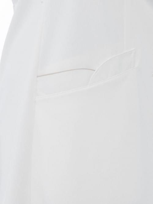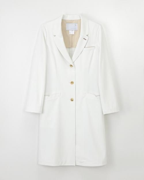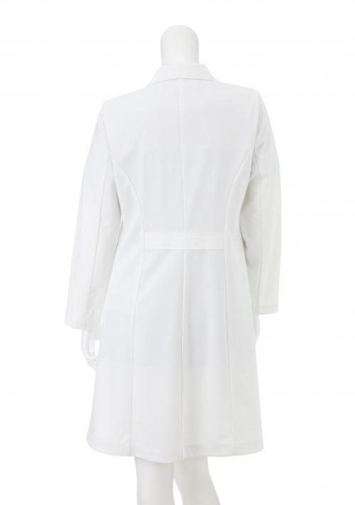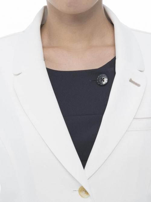 衿・返り線・ポケット等に曲線を多用し、女性らしい上品な優しさを表現しています。素材はストレッチ性と涼感性のあるニット素材を使用しています。フラワーホールやポケットにベージュの配色を施し、さらに背裏布にストライプ生地を使用して上品で落ち着きのある雰囲気に仕上げました。